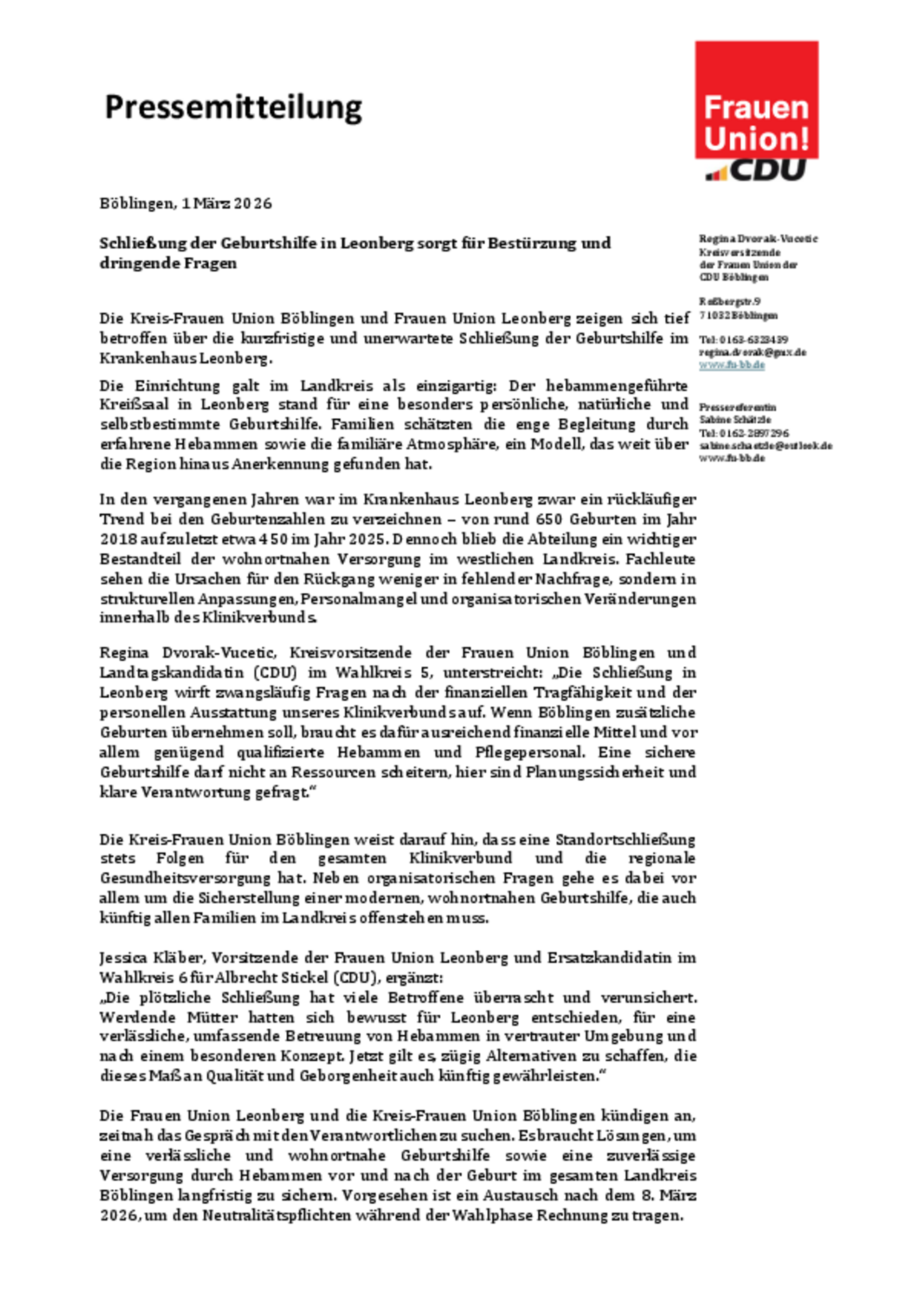 Pressemitteilung der Frauen Union Kreisverband zur geplanten Schließung der Geburtshilfe in Leonberg